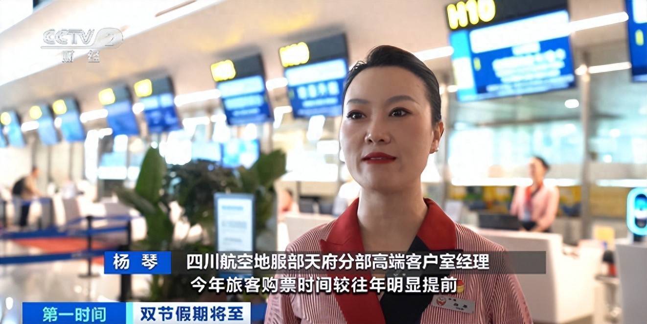 四川航空地服部天府分部高端客户室经理 杨琴:预售情况来看,今年旅客购票时间较往年明显提前,9月30日和10月1日为节前出行的高峰,成都飞往北京、深圳、杭州等地的部分航班客座率已经达到了80%,敦煌、阿勒泰等西北航点机票已经基本售罄。